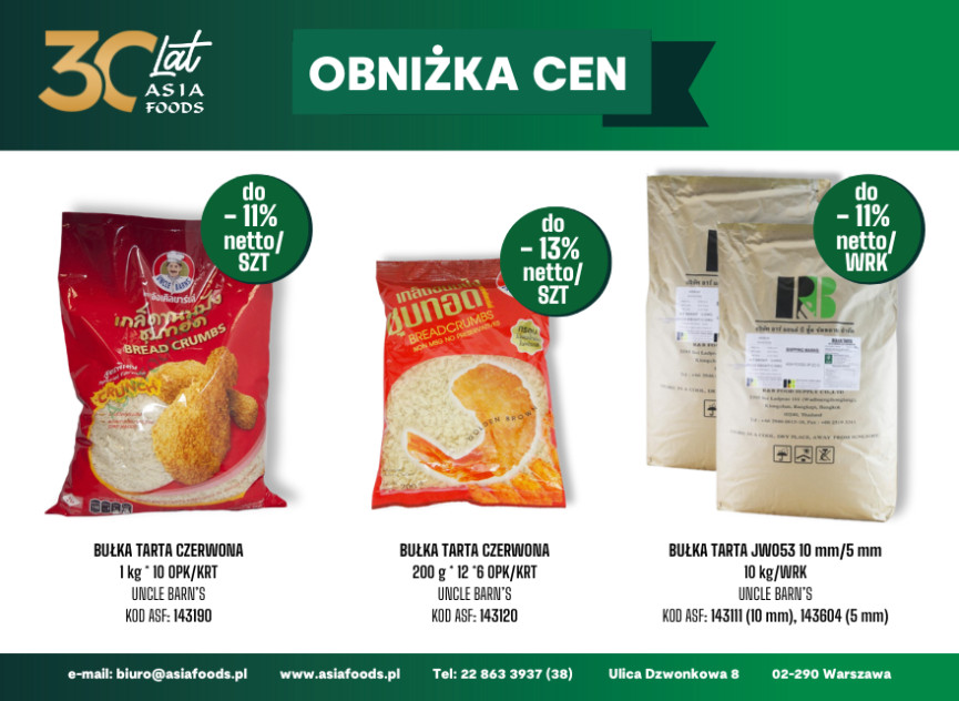 W szerokiej gamie opakowań i rozmiarów, idealnych zarówno dla dużych kuchni restauracyjnych, jak i sla półek ze specjałami azjatyckimi w Państwa sklepach, teraz firma Asia-Foods z przyjemnością przedstawia nowe, bardziej korzystne ceny na różne rodzaje panierki Uncle Barn's: