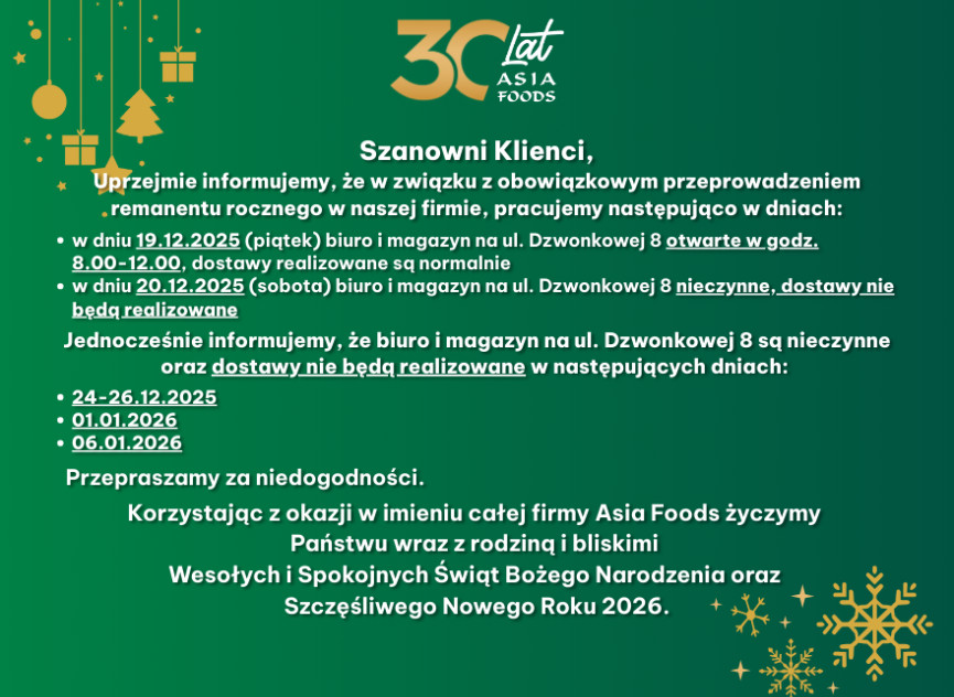 Korzystając z okazji w imieniu całej firmy Asia-Foods życzymy Państwu wraz z rodziną i bliskimi Wesołych i Spokojnych Świąt Bożego Narodzenia oraz Szczęśliwego Nowego Roku 2026.