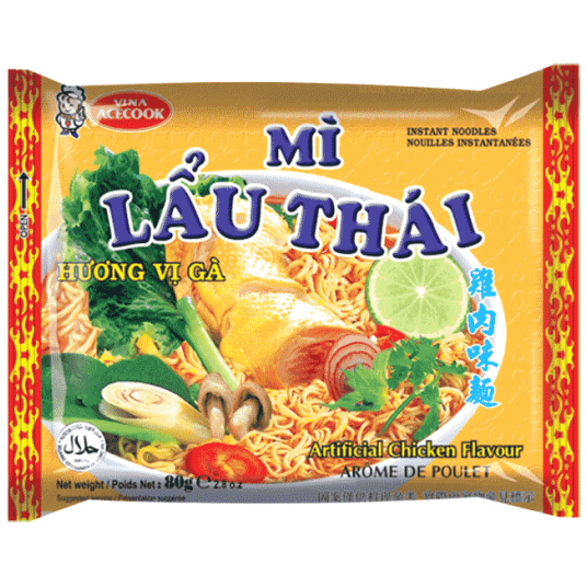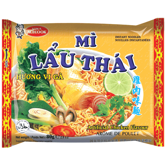 Składniki: Makaron (83%): Mąka pszenna, Olej roślinny (Olej palmowy, Przeciwutleniacze: E320, E321), Skrobia, Sól, Cukier, Sos rybny (Stolephorus SPP), Regulatory kwasowości: Trifosforany (E451), Węglany potasu (E501), Węglany sodu (E500): Wzmacniacz smaku: Glutaminian sodu (E621)
