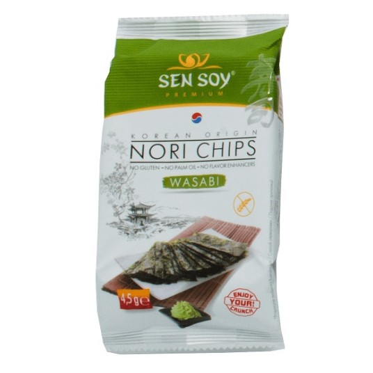 Chipsy Nori o smaku Wasabi - autentyczny i wyrazisty smak Wasabi czuć przy pierwszym dotknięciu języka z płątkiem chipsów nori. Piękny design, opakowaniu jednoznacznie wskazuje na wysoką jakość produktu. Bez glutenu, bez oleju palmowego, bez wzmacniaczy smaków.