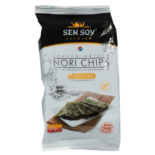 Chipsy Nori klasyczne - dla miłośników klaszycznego smaku chipsów z alg morskich. Chrupiące płatki nori prażone w oleju sezamowym zachowują wszysztkie wyjątkowe właściwości wodorostów. Bez glutenu, bez oleju palmowego, bez wzmacniaczy smaków.