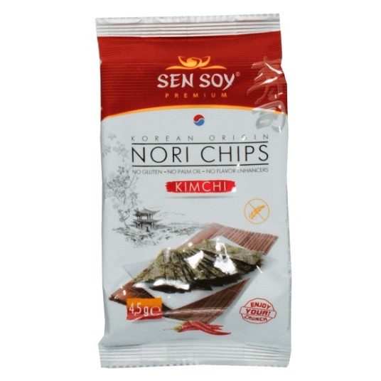 Chipsy Nori o smaku Kimchi - symbol koreańskiej kuchni w chrupiących płatkach prażonych alg morskich. Piękny design charaterystyczny dla wszystkich produków Sensoy. Bez glutenu, bez oleju palmowego, bez wzmacniaczy smaków.